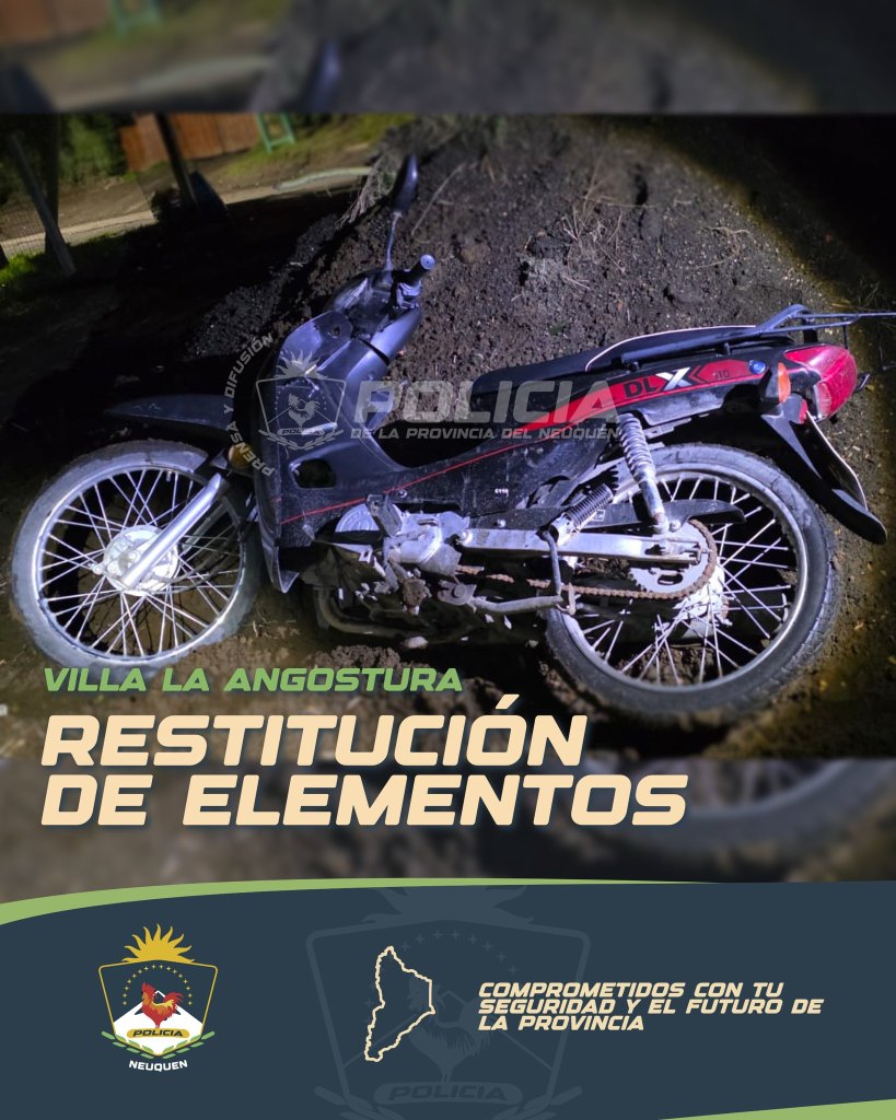 En un parte de prensa la Policía del Neuquen informo que esta madrugada, tras tareas de campo, personal de la Comisaría 28º Villa la Angostura, recuperó e hizo entrega a su legítimo propietario de una motocicleta marca Motomel, modelo C110 DLX.