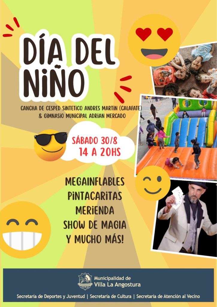 La Municipalidad de Villa La Angostura invita a todas las familias a compartir una tarde llena de juegos, alegría y sorpresas en el marco de la celebración del Día del Niño, que se realizará el sábado 30 de agosto, de 14 a 20 hs, en la Cancha de Césped Sintético Andrés Martin (Calafate) y en el Gimnasio Municipal Adrián Mercado.