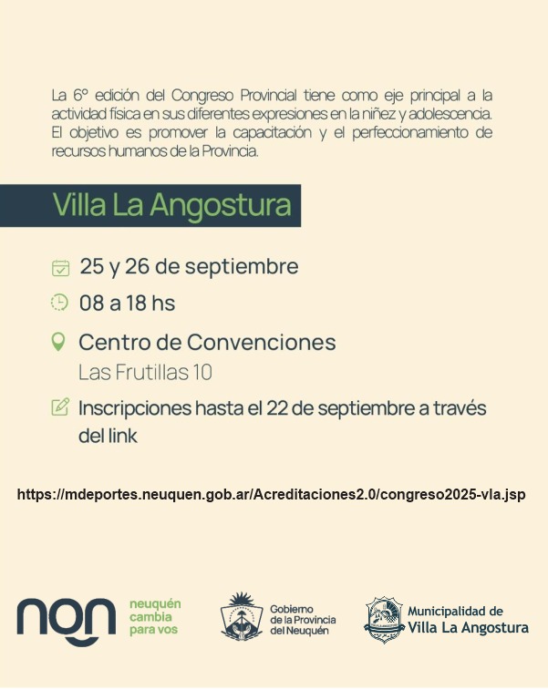 El Congreso otorga puntaje docente según Resolución CPE N° 0681/2025. Villa La Angostura: 25 y 26 de septiembre Inscripciones abiertas hasta el 22/09 en Villa La Angostura a través del link https://mdeportes.neuquen.gob.ar/Acreditaciones2.0/congreso2025-vla.jsp