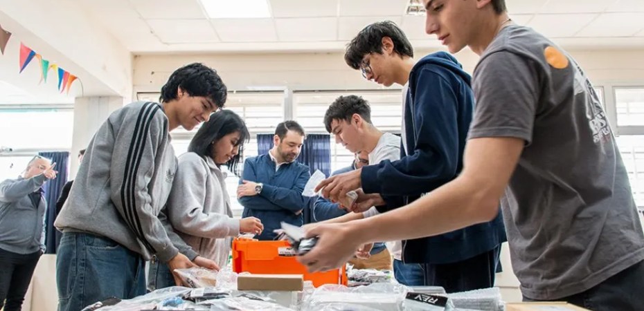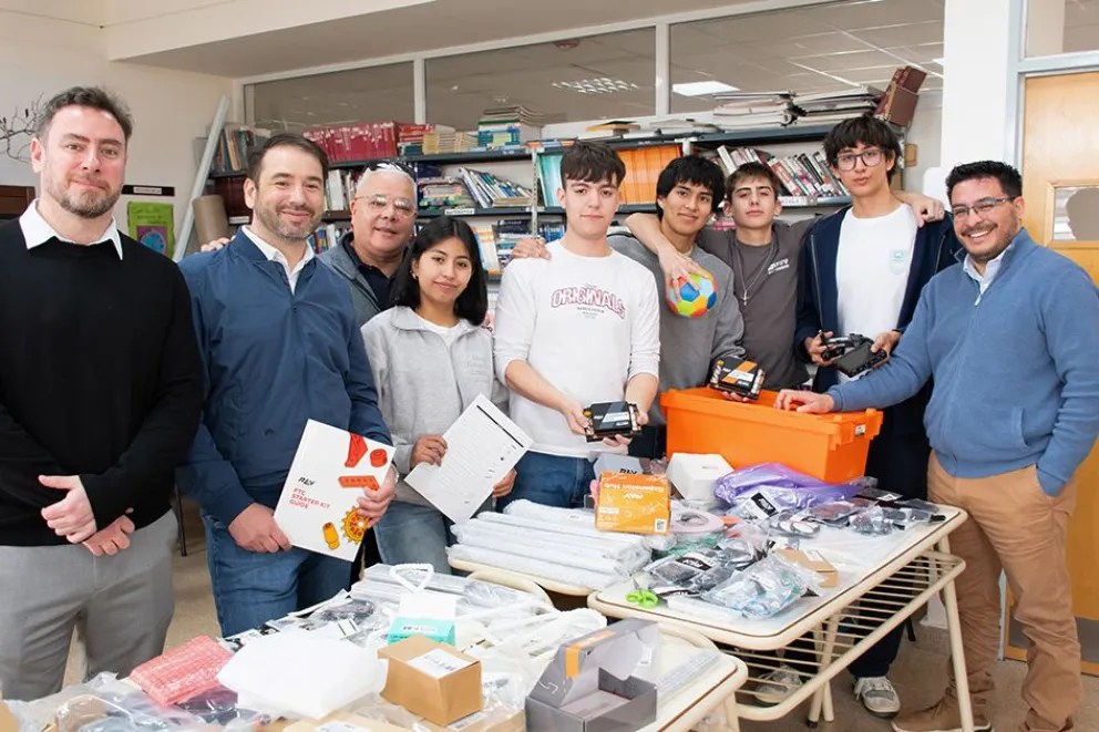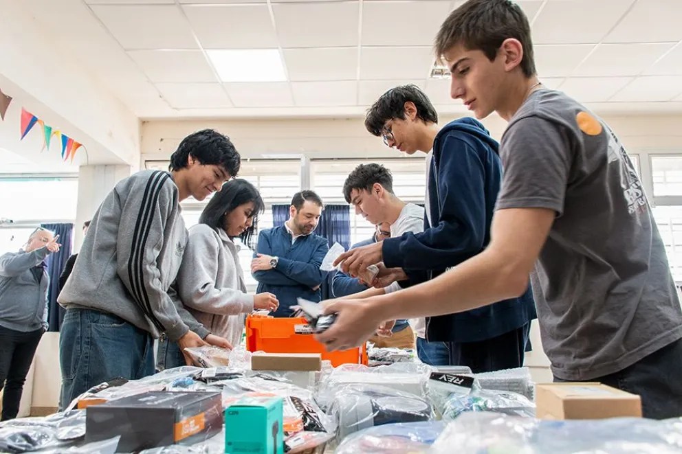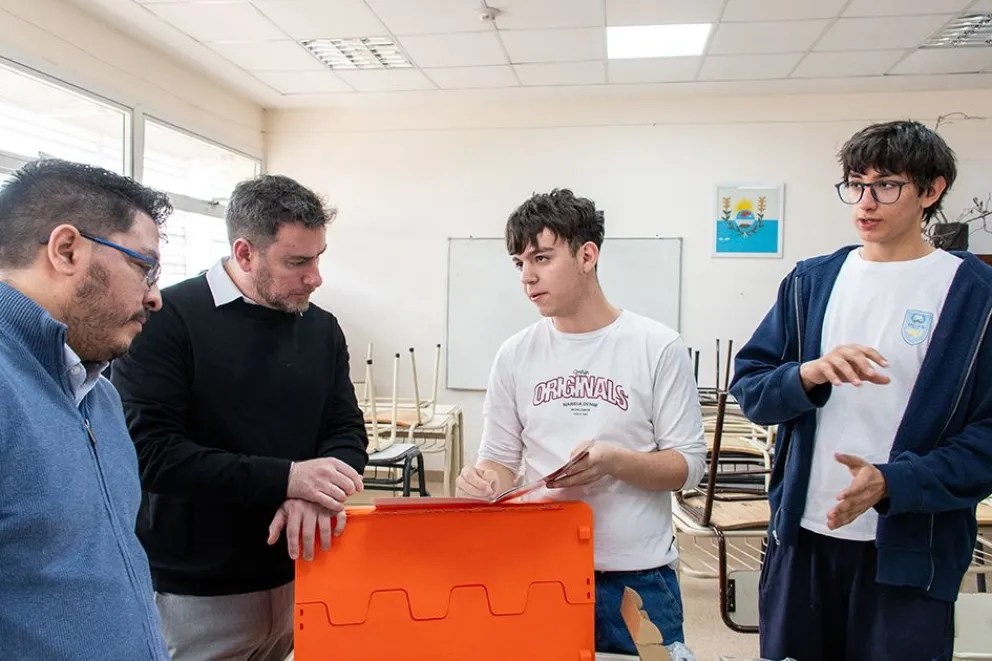 El grupo constructor integrado por Maximiliano Sánchez Deoseffe, Tiago Rodríguez Ornaeche, Julieta Ramírez, Juan Pugh y Lázaro Cáceres Turón, junto al director institucional Jesús Pérez, recepcionaron los materiales en compañía del subsecretario de Tecnología Educativa y Modernización, Lucas Godoy, y del director provincial del área, Rolando Rodríguez, quien aprovechó para dialogar con los estudiantes sobre aspectos técnicos y organizativos.