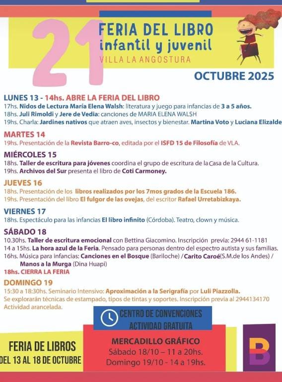 La Municipalidad de Villa La Angostura, junto a La Biblioteca Popular Osvaldo Bayer, invita a disfrutar de una nueva edición de la Feria del Libro Infantil y Juvenil, un clásico cultural de nuestra localidad que celebra la lectura, la creatividad y el encuentro comunitario.
