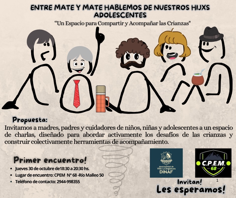INVITACIÓN A LAS FAMILIAS “ENTRE MATE Y MATE, HABLEMOS DE NUESTROS HIJOS ADOLESCENTES” – Un espacio para compartir y acompañar las crianzas, el Equipo de coordinación de Dispositivos de Promoción y Protección de Derechos de la Dirección de Niñez, Adolescencia y Familia (DINAF), en articulación con el Equipo de Asesoría Pedagógica del Colegio Secundario CPEM n°68, tiene el agrado de invitar a participar del tercer módulo del Dispositivo de Apoyo a las Crianzas.
