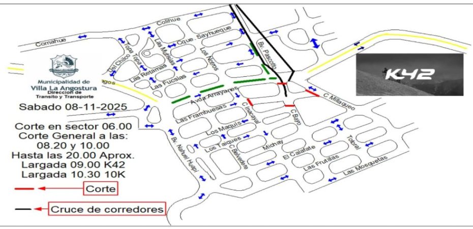 La Municipalidad de Villa La Angostura a través de la Dirección de Transito y Transporte informa a la comunidad que, con motivo de la realización de la Carrera K42, se llevarán a cabo restricciones al tránsito y transito asistido en distintos sectores de la localidad durante los próximos días.