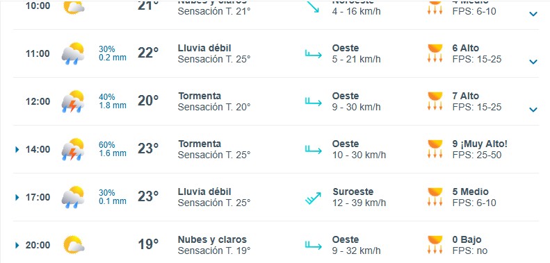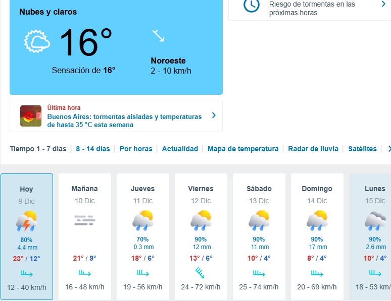 Al mediodía de hoy Martes 9 de Diciembre es donde el pronostico anuncia con una gran chance de probabilidad que algunas tormentas eléctricas aisladas puedan ocurrir hasta las 15 horas aproximadamente.