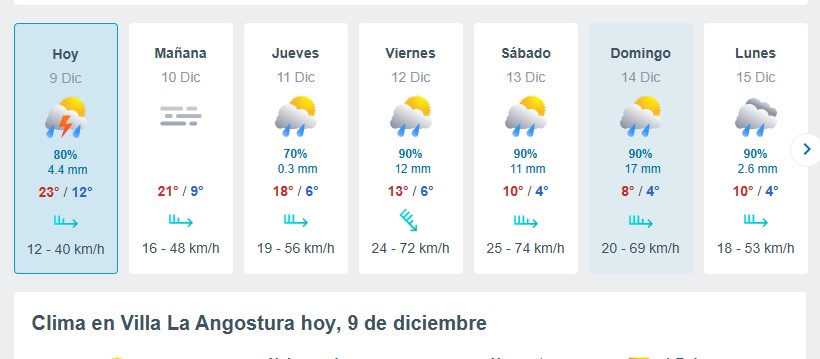 Hoy en Villa La Angostura, lluvia débil con cielo parcialmente nuboso esta mañana, con temperaturas alrededor de 18°C. Por la tarde, tendremos chubascos tormentosos con cielo parcialmente nuboso y con temperaturas en torno a los 21°C. Durante la noche, habrá nubes y claros con temperaturas cercanas a los 17°C. Vientos del Oeste a lo largo del día, con una velocidad media de 6 km/h.