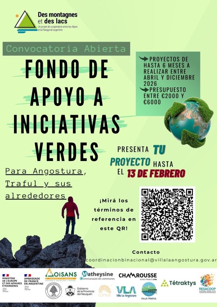 En el marco del Proyecto de Cooperación Internacional “Montañas y Lagos”, entre entes territoriales de la Patagonia Argentina y los Alpes Franceses, se lanzó el “Fondo de Apoyo a Iniciativas Verdes”, el cual tiene como objetivo principal apoyar iniciativas ecológicas con enfoque hacia el desarrollo sostenible en los municipios de Villa la Angostura y Villa Traful y sus alrededores, en la Provincia del Neuquén.