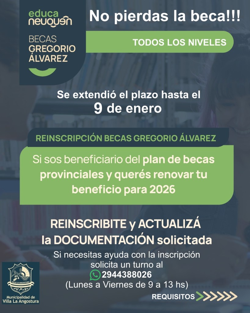 Desde Provincia informaron que el plazo para la Reinscripción de las becas Gregorio Álvarez se extendió hasta el 9 de Enero.