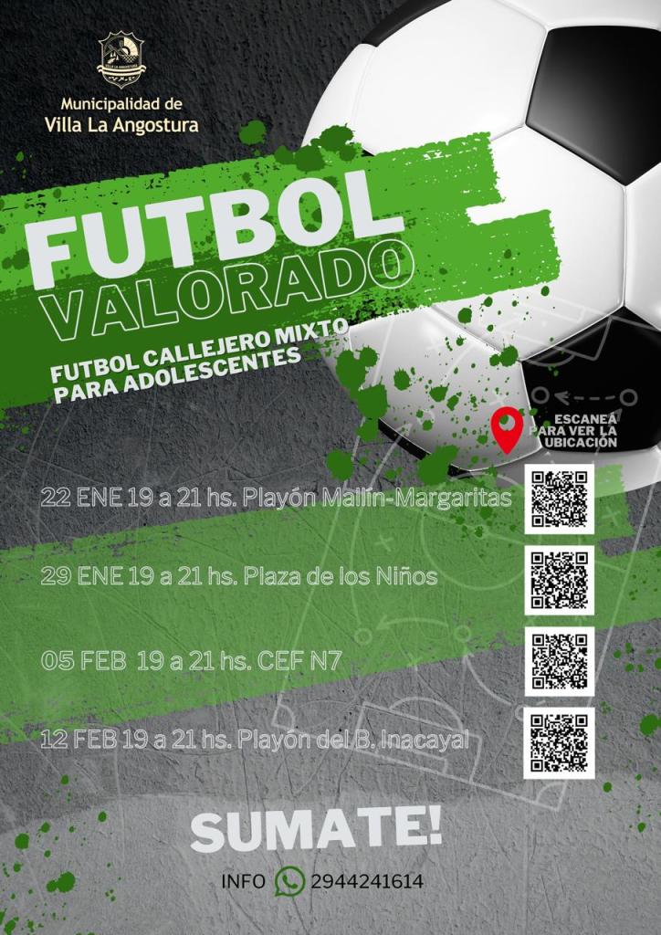 Te invitamos a participar del Fútbol Valorado, una actividad gratuita que se realizará en distintos playones barriales. Súmate para armar el primer equipo de Fútbol Callejero Mixto de Villa la Angostura, no se necesita experiencia previa!