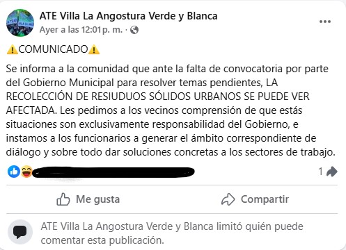 En una situación que demuestra claramente que no están dispuestos a resignar ninguno de sus privilegios, la casta sindical que conduce el conflicto en Angostura, otra vez apuesta al descontento y a la confusión dejando sin recolección a la mayoría del Pueblo. Con el conflicto político de fondo, que dejo a muchos usuarios sin agua, ahora se le suma este conflicto Sindical, que pondrá a prueba la reacción y firmeza de ejecutivo para resolver este tipo de «testeo» para lo que viene; en un año político de alto voltaje, por la elección de gobernador que en Neuquen siempre se adelanta muchísimos meses.