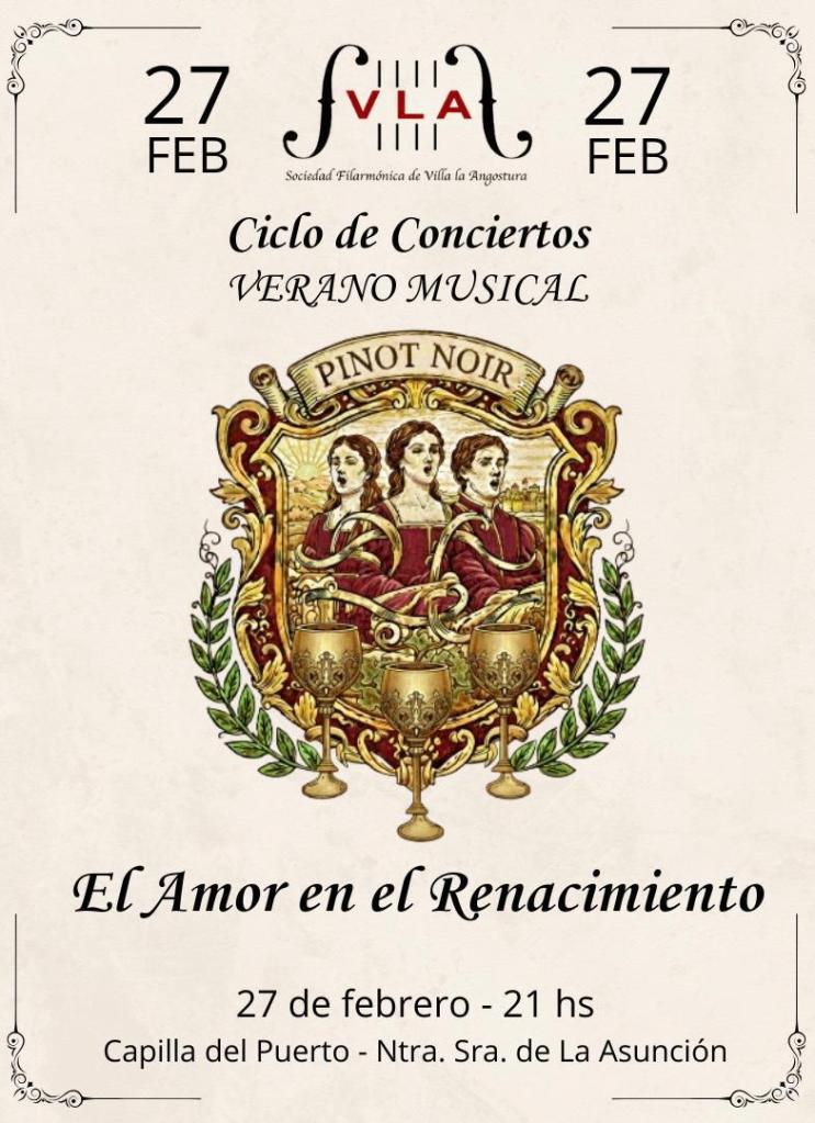 La sociedad Filarmónica de Villa la Angostura anuncia el El trio vocal «Pinot Noir», un grupo que se dedica a la interpretación de música vocal del siglo XV y XVI, que se presentara con el concierto que lleva el nombre «El Amor en el Renacimiento».