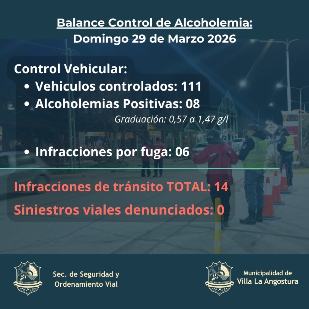 La Subsecretaría de Seguridad y Ordenamiento Vial de Villa La Angostura informa el balance de los operativos de control y prevención realizados en conjunto con la Policía de la Provincia del Neuquén, en la noche del 29 de marzo del corriente año.