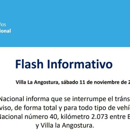 Vialidad informa de la interrupción del transito hasta nuevo aviso, entre Angostura y Bariloche por Gravísimo accidente.